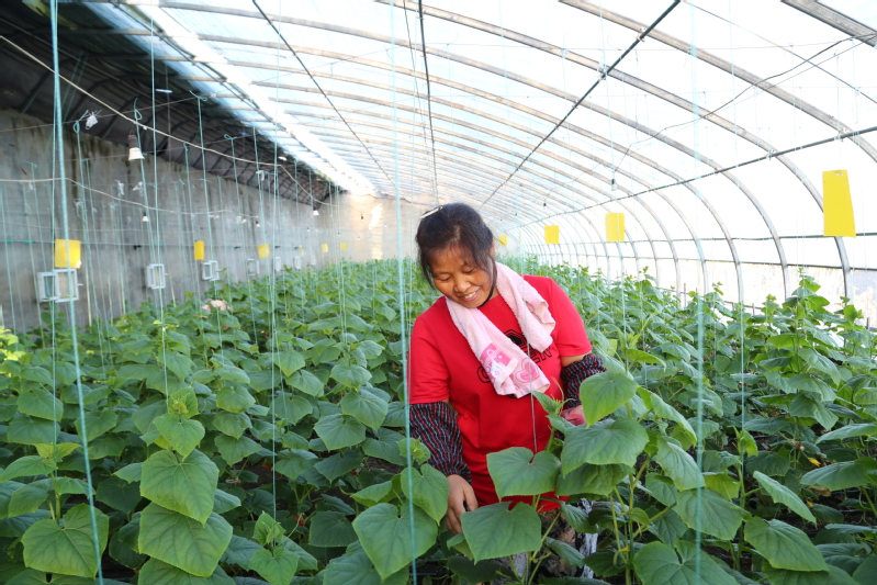 走進(jìn)崗埠富民農(nóng)業(yè)科技園32號溫室大棚,滿眼盡是綠意,一排排整齊的秧苗長勢旺盛,如青玉般細(xì)嫩的小黃瓜在翠綠的葉片襯托下,身著綠裝,格外誘人。連日來,園區(qū)加強(qiáng)精細(xì)化管理,從消毒、栽種、水肥運(yùn)籌等流程上嚴(yán)格作業(yè),確保水果黃瓜果型優(yōu)良、綠色生態(tài)。圖為工人正在進(jìn)行“蘸花”作業(yè)。