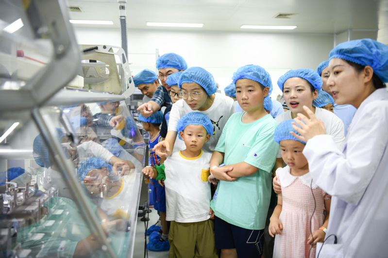 云港連夏荷,晴天正秋風(fēng)。8月20日,正大天晴第二季“愛在天晴 家倍美好”家庭活動日在連云港廠區(qū)舉辦。開幕式上,人力資源中心總監(jiān)代表公司向在企業(yè)發(fā)展中辛勤付出的天晴人及其背后的家人表示感謝,同時(shí)宣布自2024年起,正大天晴將增設(shè)“高考陪考假”,切實(shí)將公司的“六為文化”及“家文化”傳遞給每一位勤奮拼搏的天晴人。儀式上,公司代表為即將開啟大學(xué)生活的“晴二代”們送上升學(xué)祝賀、頒發(fā)獎學(xué)金。伴隨著熱烈的掌聲和飛向天際的氣球,第二季家庭日活動在歡聲笑語中正式開啟。在研究院,小朋友們在研發(fā)人員的指導(dǎo)下,小心翼翼地將白色乳糖粉末填充到膠囊殼中。往常見到都要躲著走的膠囊,這一刻卻成了愛不釋手的小寶貝。在精心準(zhǔn)備的化學(xué)小試驗(yàn)中,生活中常見的醋、雪碧,都有自己專屬的“酸堿色”。玻璃瓶中的五顏六色激起了孩子們的好奇心和求知欲,也在他們心中播下了一顆探索的種子。在生產(chǎn)車間,小朋友們隔著護(hù)欄近距離地觀看正在作業(yè)的機(jī)械臂,伸展、抓取、轉(zhuǎn)身、放置……機(jī)械手臂行云流水般的動作讓他們發(fā)出陣陣驚嘆。在大型生產(chǎn)設(shè)備前,孩子們?nèi)褙炞⒌芈犞v解。現(xiàn)代化藥物生產(chǎn)車間在小朋友眼里像極了鎧甲勇士的基地,置身其中,像是一腳踏進(jìn)了特?cái)z片的